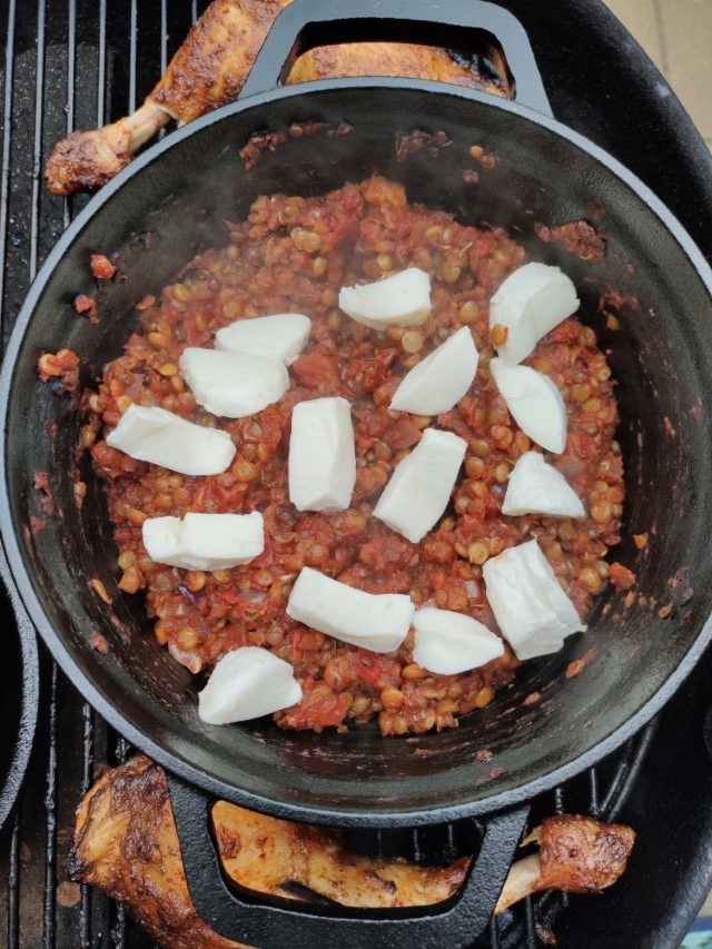 Laat de DO 45 minuten op 180 graden in de BBQ. Voeg de laatste 5 minuten de mozzarella.
